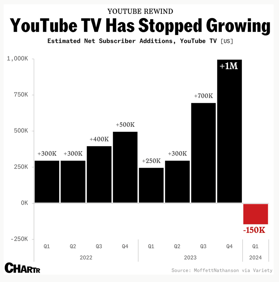 “YouTube TV” might sound like something of an oxymoron — with many turning to YouTube for short hits or highlights — but, since its launch in 2017, the premium service from YouTube had grown steadily to some 8 million subscribers. At least, until Q1 this year, when it took its first backward step. Estimates from MoffettNathanson, reported by Variety’s VIP+, reveal that YouTube TV experienced its first quarterly loss of subscribers, dropping 150K paying members, as the virtual pay TV service begins to grapple with the seasonality of live sports offerings. The end of the football season — live TV's largest draw — makes Q1 particularly challenging for pay TV and this year the exodus wasn’t just limited to traditional cable.