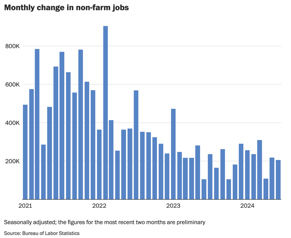 Federal Reserve Chair Jerome Powell stated that inflation is slowing but it's not yet time to cut interest rates (AP). The U.S. labor market is showing signs of slowing down, with fewer job openings and a slight rise in unemployment (Bloomberg). Employers added 206,000 jobs in June, reflecting a gradual cooldown in the labor market (WP🔒) 📊.
