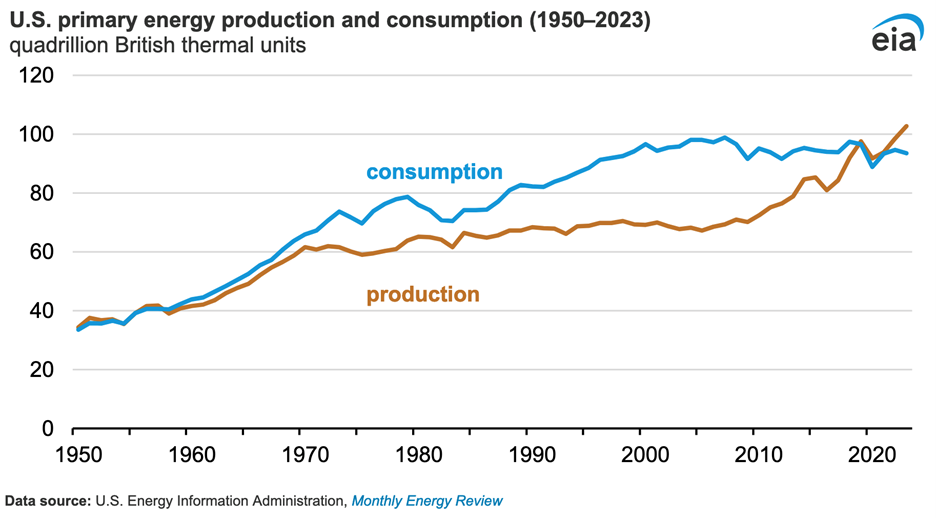In 2023, U.S. energy production exceeded consumption by a record amount, with production rising and consumption falling (EIA) 📊.