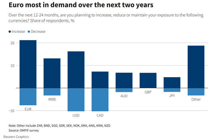 Once hurt by crises and deflation, the euro is gaining popularity among central bank reserve managers thanks to a return to positive rates and geopolitics challenging king dollar's appeal. Roughly one in five of the 75 central banks surveyed by the London-based OMFIF think-tank anticipate increasing euro holdings over the next two years, its recently published 2023 report showed. While 7% looked to decrease euro holdings, net demand was higher than for any other currency during the period and a jump from the 2021 and 2022 surveys of reserve managers controlling nearly $5 trillion.