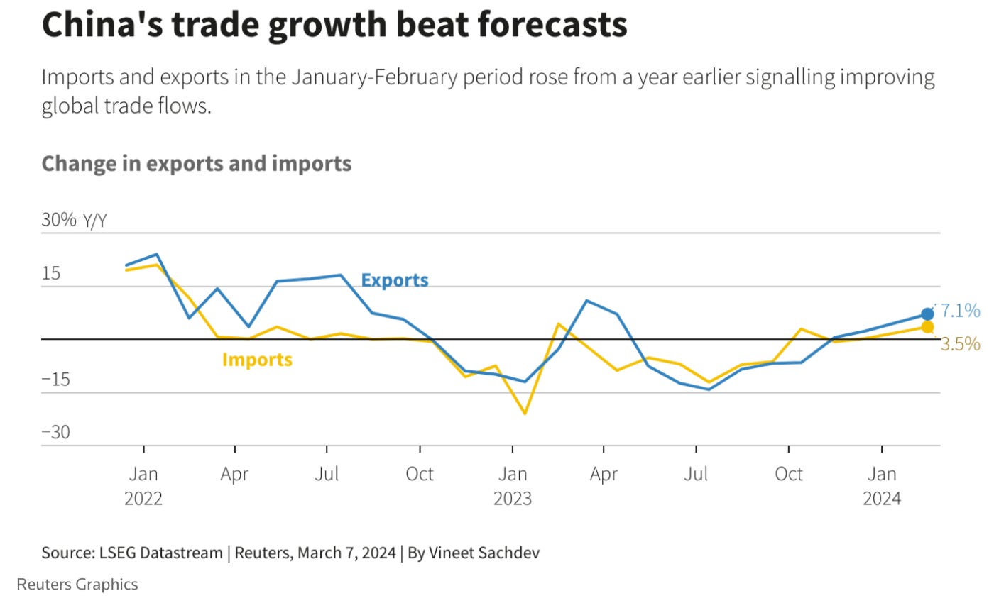 China's export and import growth in the January-February period beat forecasts, suggesting global trade is turning a corner in an encouraging signal for policymakers as they try to shore up a stuttering economic recovery.