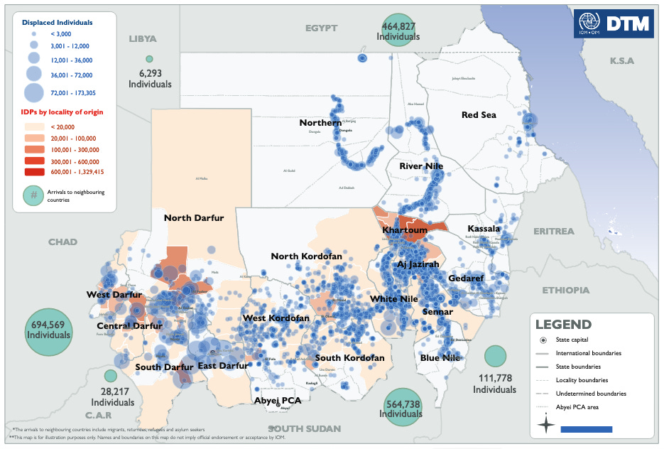 Since 15 April 2023, on-going armed clashes between the Sudanese Armed Forces (SAF) and the Rapid Support Forces (RSF) have led to widespread displacement. As a result of these clashes, DTM Sudan estimated that 6,270,676 individuals (1,249,695 households) were internally displaced.