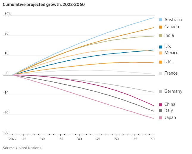 To wrap up, here’s a chart from the WSJ comparing the future projected growth of select countries. As you can see, one take-away is that India is on the rise, as China is on the decline.