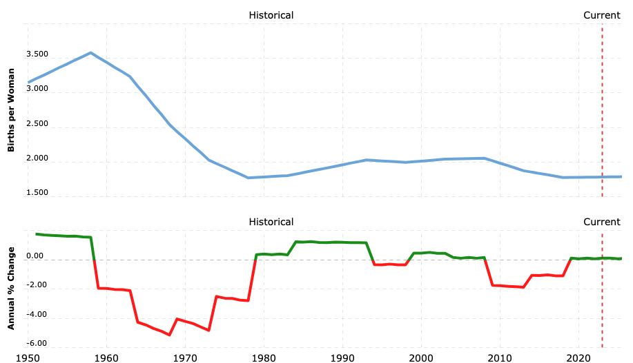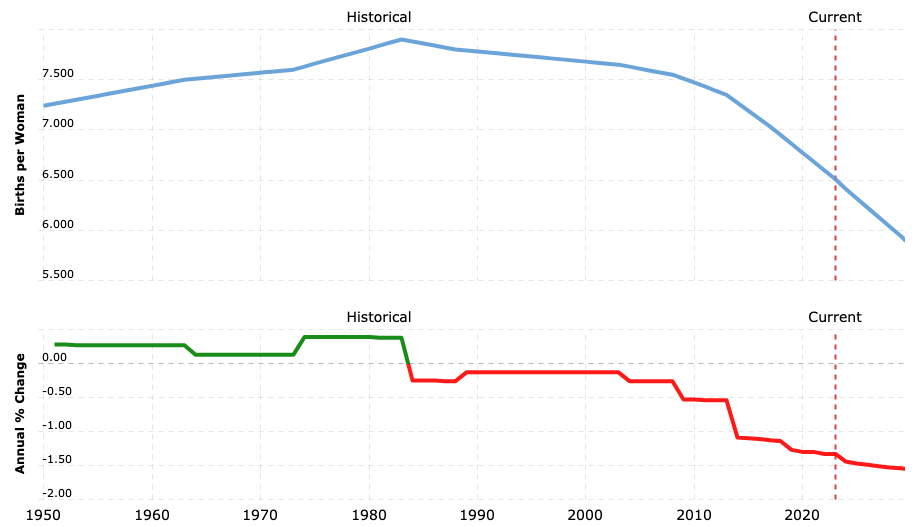 While birth rate measures the number of children born per 1,000 people, fertility rate measures the number of children born to a woman of childbearing age. The chart below from World Population Review shows current fertility rates. You’ll notice it tracks closely with birth rates, though there are some differences.