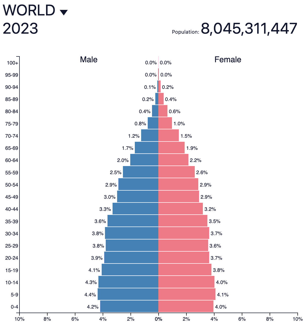 While average age tells you a story, it doesn’t tell you the whole story. To dig deeper, we can look at population pyramids, like the one below, to see the population in five-year cohorts. The below pyramid is for the world at large.