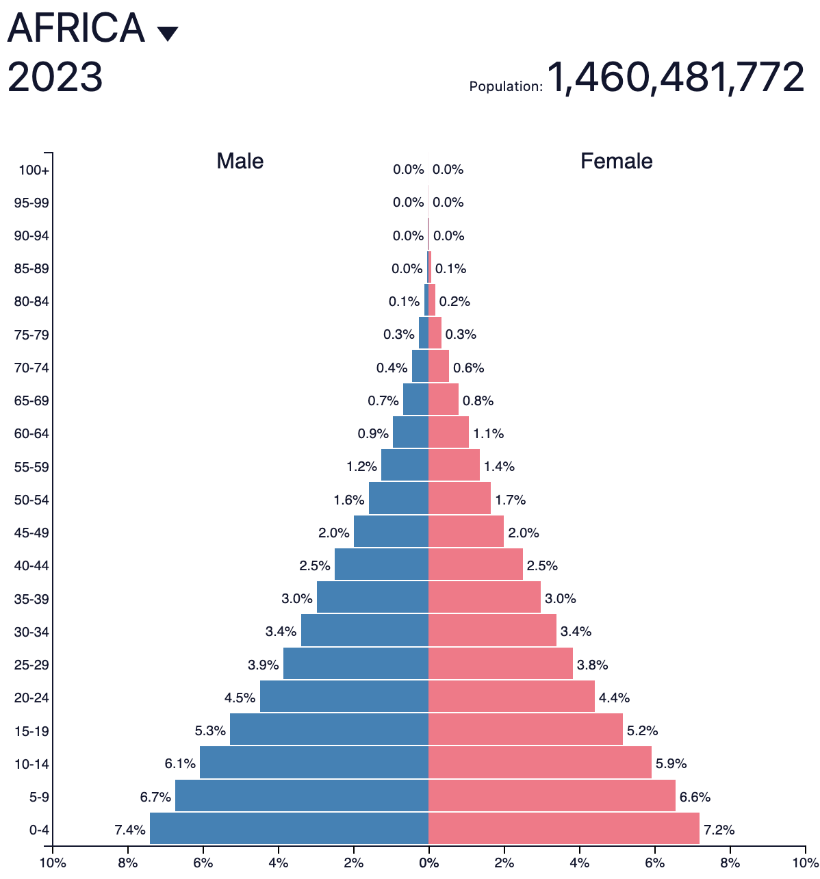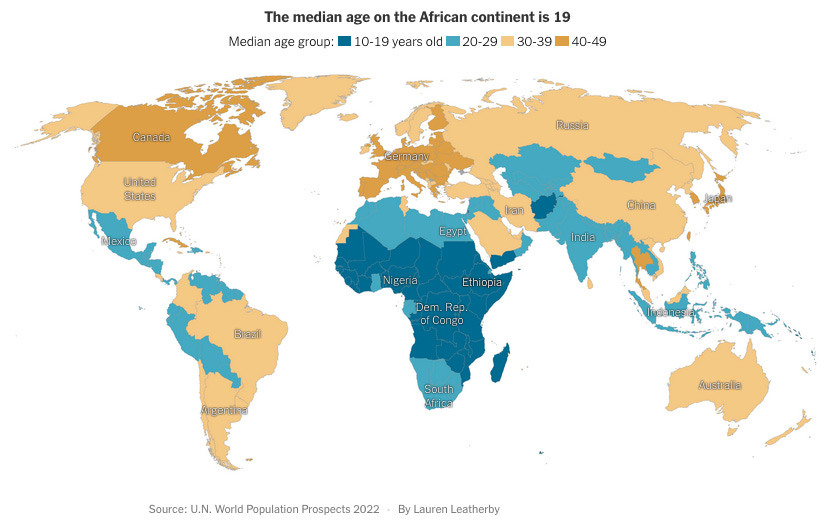 The biggest takeaway from this chart is that the continent of Africa has a disproportionate number of countries with a very young population.
