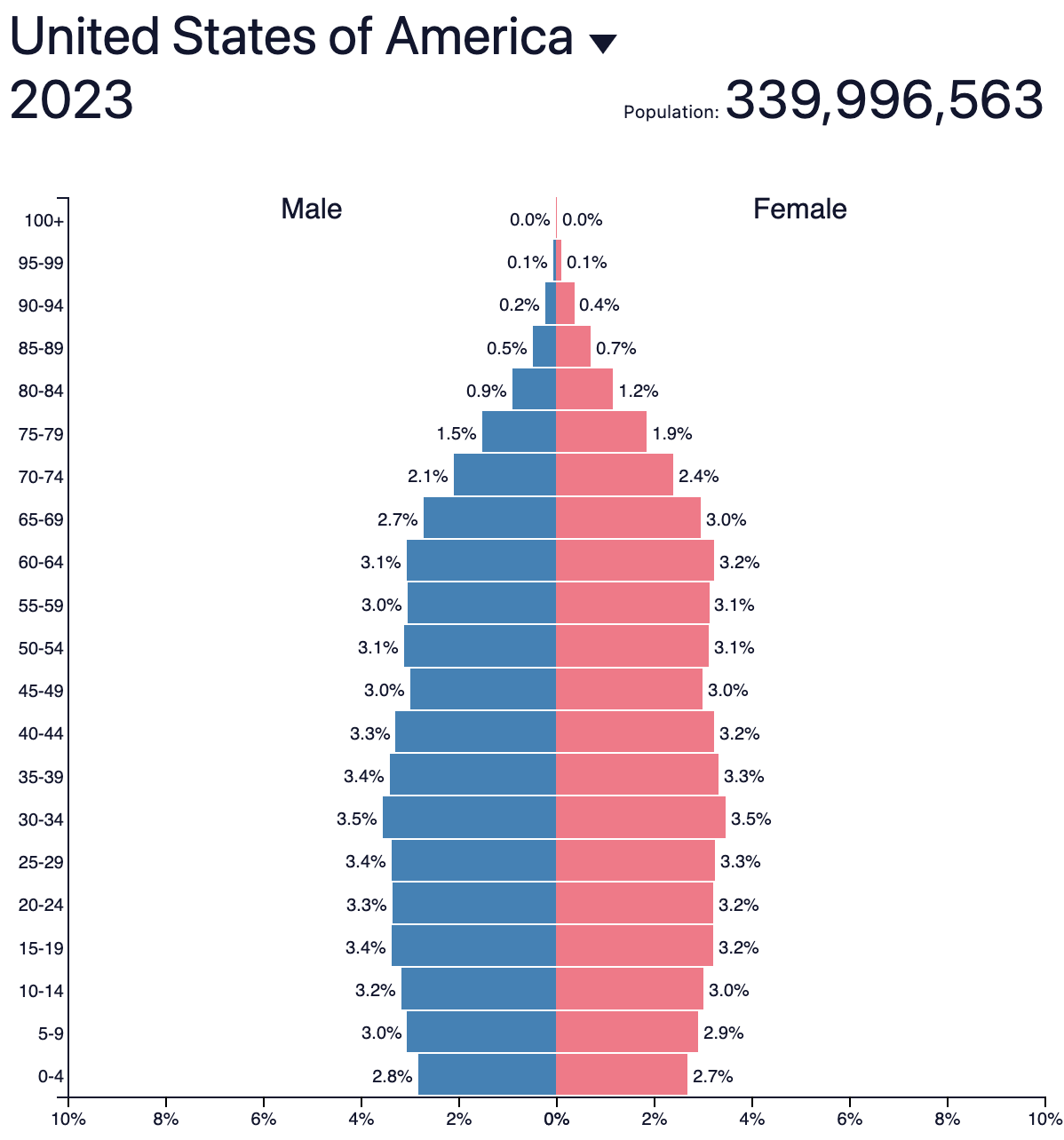 Given that the US has a fertility rate less than 2.1, the US will be unable to maintain its population size on births alone; you can see it in population pyramid below. Note the concerning lower percentages at the younger ages. More on this later.