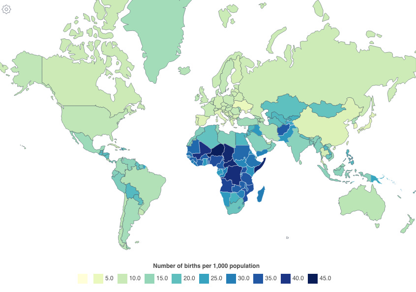 I’ll spare you the explanation of human procreation (you can watch this video, if you need); instead let’s just jump ahead to the post-birthing part. This chart from World Population Review provides a snapshot of current birth rates: