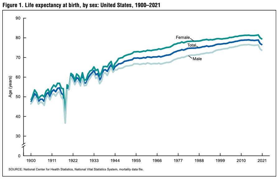 In 2021, the overall expectation of life at birth was 76.4 years, decreasing 0.6 year from 77.0 in 2020. From 2020 to 2021, life expectancy at birth decreased by 0.7 year for males (from 74.2 to 73.5) and by 0.6 year for females (79.9 to 79.3).