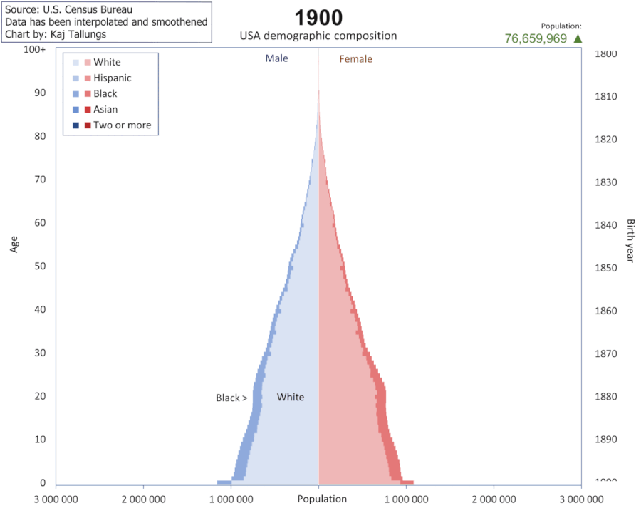 Lets go back to the population pyramid for the US. The below animation shows how it’s changed over time—especially during the Baby Boom of the 1950’s and 1960’s.