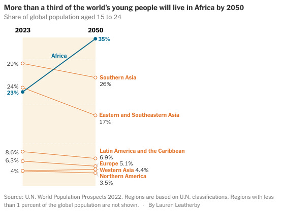 Astonishing change is underway in Africa, where the population is projected to nearly double to 2.5 billion over the next quarter-century — an era that will not only transform many African countries, experts say, but also radically reshape their relationship with the rest of the world. Birthrates are tumbling in richer nations, creating anxiety about how to care for, and pay for, their aging societies. But Africa’s baby boom continues apace, fueling the youngest, fastest growing population on earth. In 1950, Africans made up 8 percent of the world’s people. A century later, they will account for one-quarter of humanity, and at least one-third of all young people aged 15 to 24, according to United Nations forecasts. The median age on the African continent is 19. In India, the world’s most populous country, it is 28. In China and the United States, it is 38. The implications of this “youthquake,” as some call it, are immense yet uncertain, and likely to vary greatly across Africa, a continent of myriad cultures and some 54 countries that covers an area larger than China, Europe, India and the United States combined. But its first signs are already here.