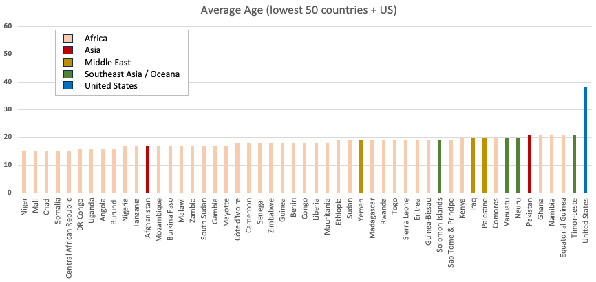 The following chart shows the 50 countries with the lowest average population age; it also includes the US for comparison.