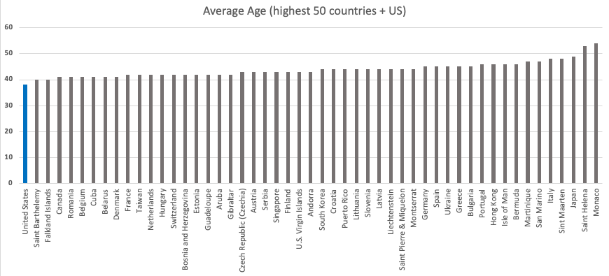 On the other end of the spectrum we have older populations. For comparison, here are the 50 countries with the highest average age, plus the US (I have not color-coded these by continent):