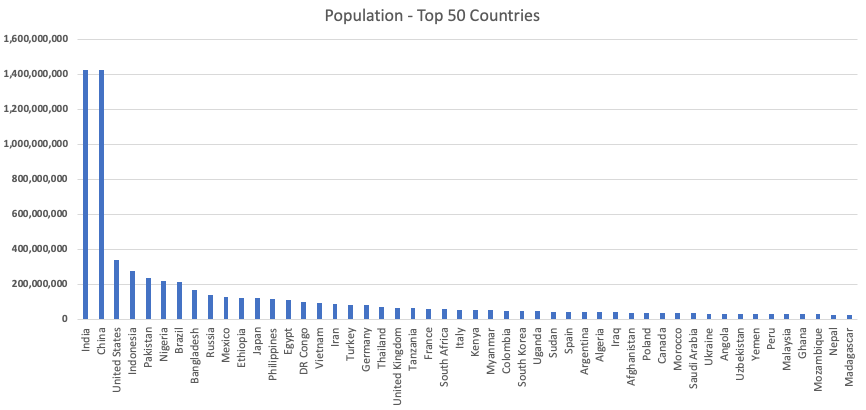 With that background, let’s turn our attention to current populations across the earth by looking at the 50 highest populated countries.