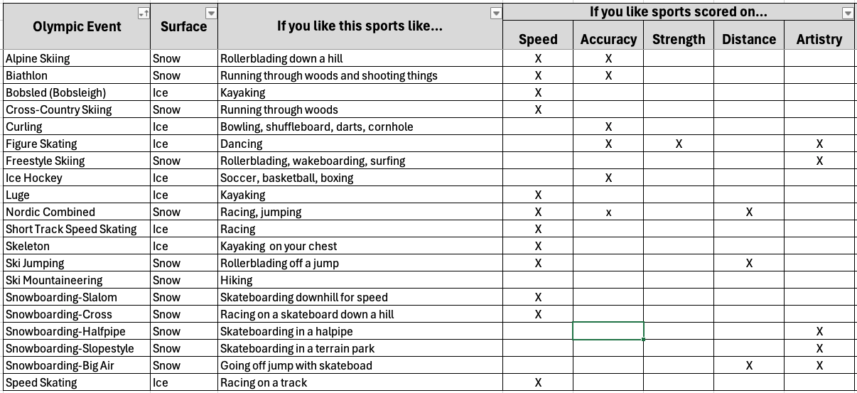 I also realized that most Winter Olympic sports have parallels to other sporting events. Sometimes the parallels are more obvious, like snowboarding and skateboarding, and speed skating and running around a track. Other times, it’s less obvious, like bobsledding and kayaking.