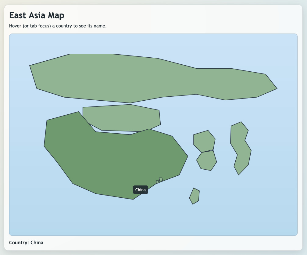 I didn’t immediately start with a world map, I started with the prompt, “Can you create a map of east asia that when I mouseover a country it tells me what country that is.” The first version was absolutely terrible: