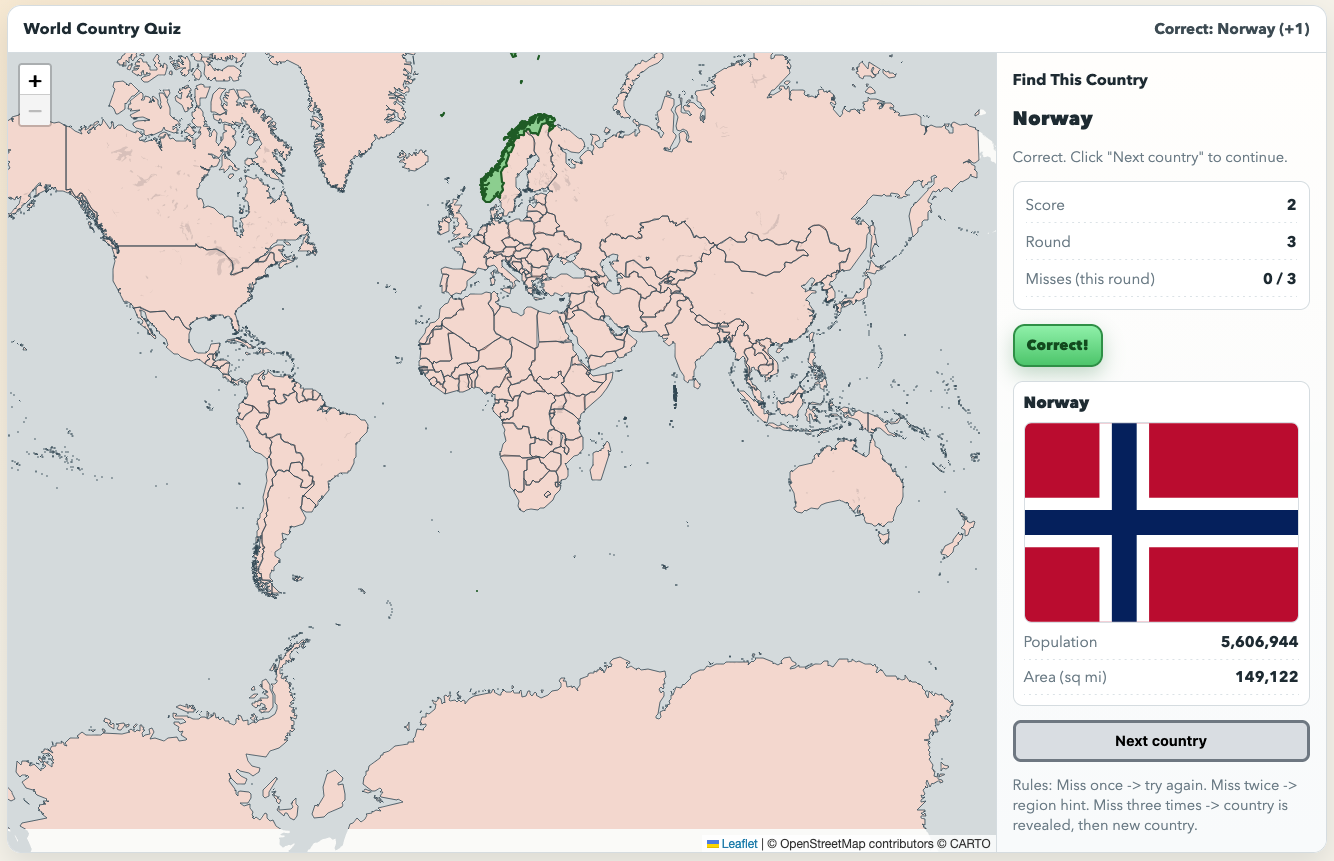 “well done. next changes: 1) add red banner that says "Incorrect" if they are not successful in finding the country (just like the green button for when they got it correct. 2) once the country is revealed (whether correct or incorrect), also show on the right their flag, population, and area (in square miles)”
